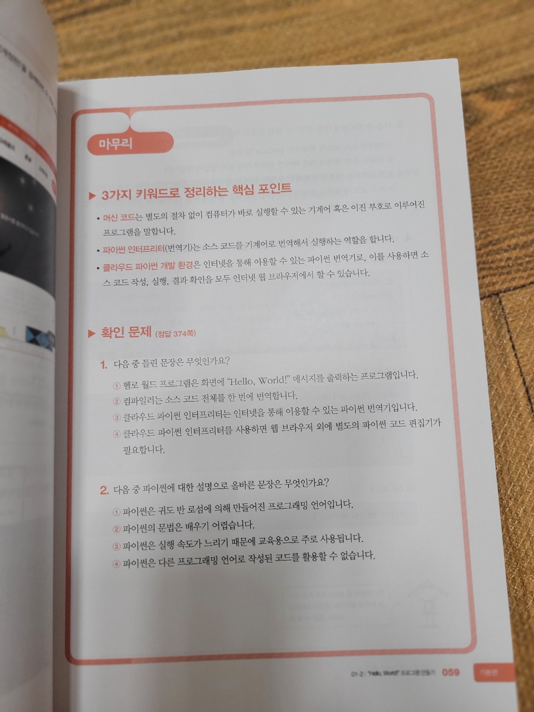 그리고 확인 문제가 앞에서 했던 내용들을 반복 확인+ 살짝 변형해서 코드 뜻을 다시금 상기 시켜주어서 1단원을 마무리할때 해당 단원에서 어떤걸 중점적으로 다루었는지 되새길때 좋았다.