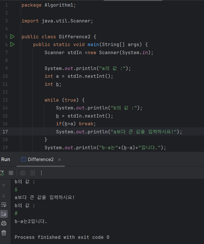 변수 b에 입력한 값이 a값 이하면 변수 b값을 다시 입력하세요