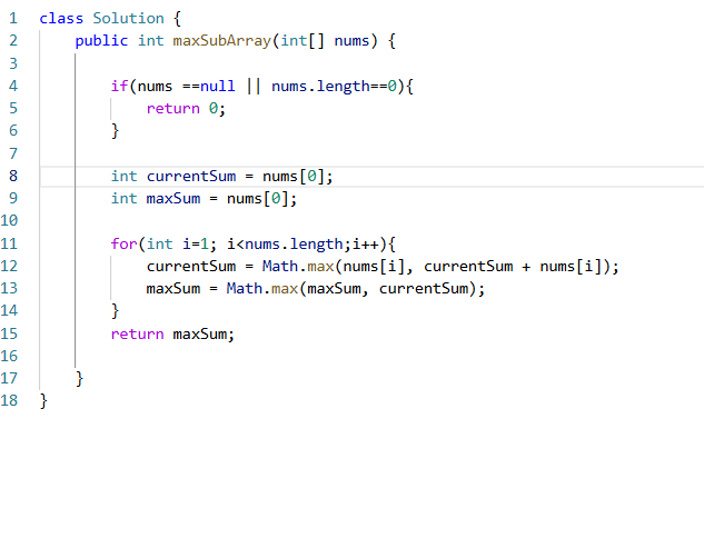 이전 부분 배열에 현재 원소 추가 currentSum + nums[i] 중에서 더 큰값을 currentSum으로 갱신